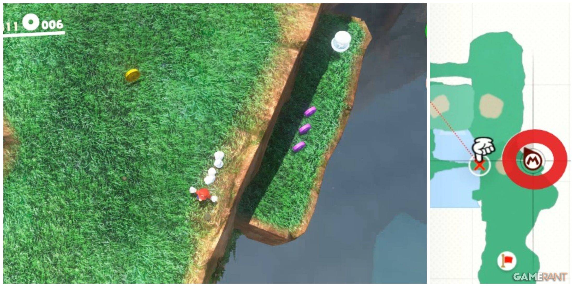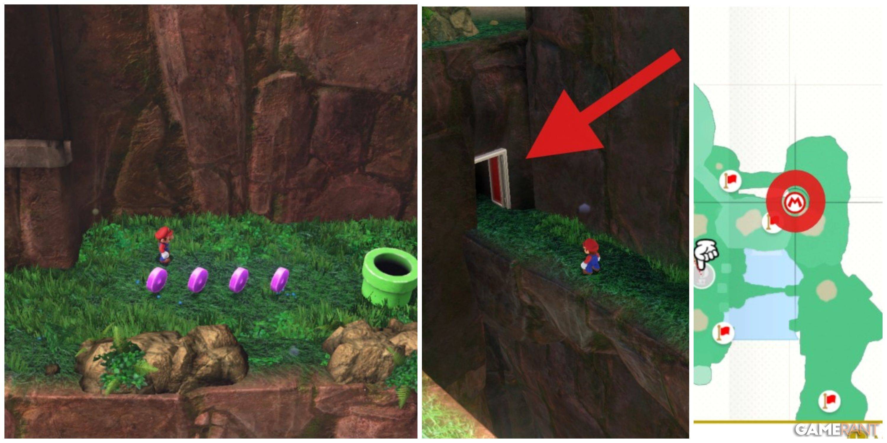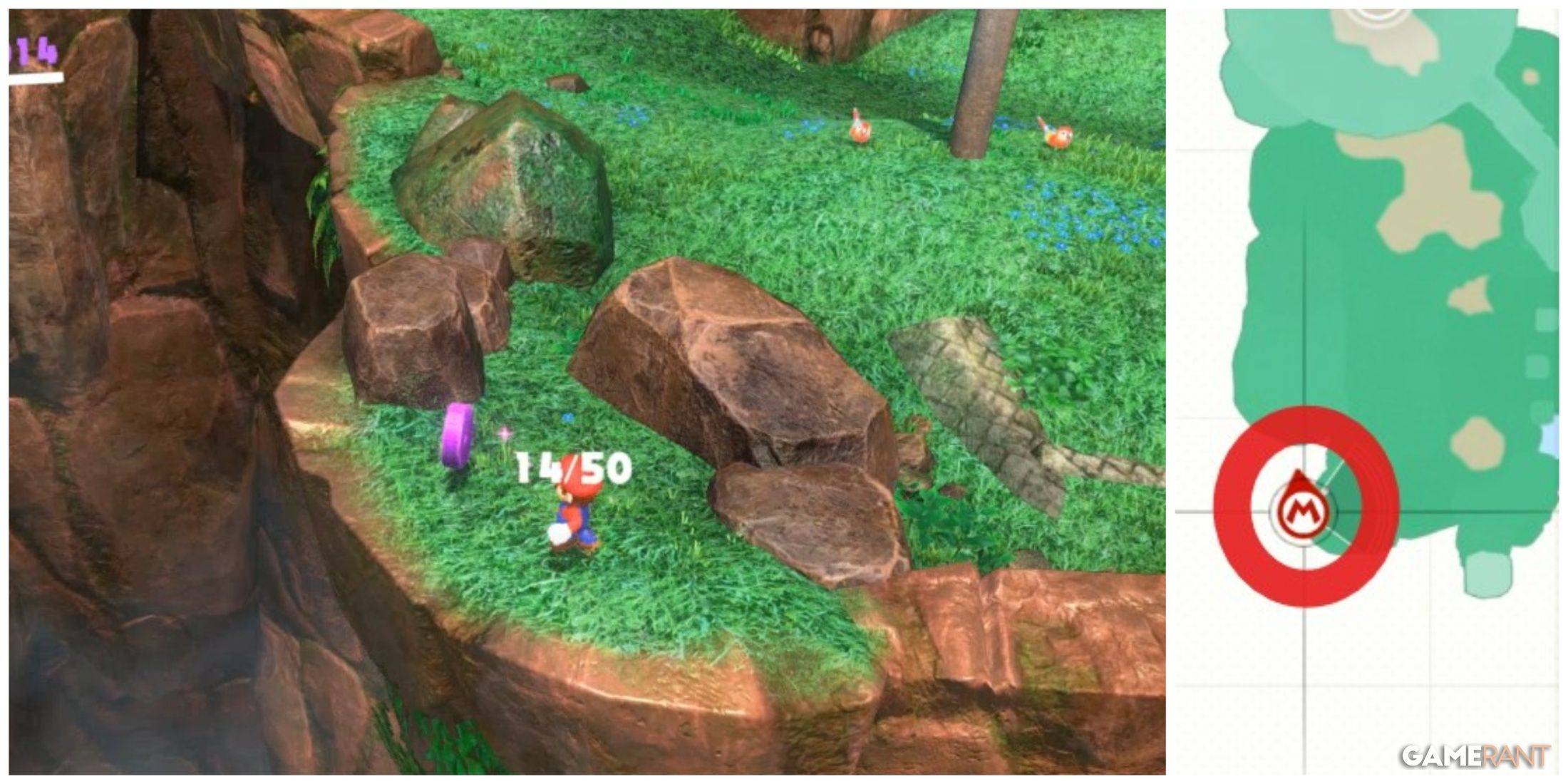 在进入山面背面的2D迷你游戏的管道之前,请寻找一个大石头平台。三枚紫色硬币栖息在顶部,准备收集。